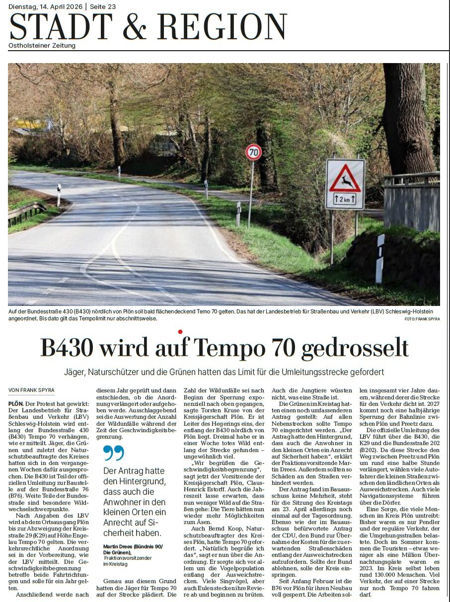 Seit der Sperrung er B76 zwischen Preetz und Plön kam es vermehrt zu Unfällen mit Wildkontakt auf der als Umleitung ausgeschilderten B430. Die zahlreichen Gespräche zwischen Kreisjägerschaft, Ordnungsamt und Polizei führt nun dazu, dass auf der B430 zwischen Plön und Engelau 70km/h als Höchstgeschwindigkeit gelten soll.